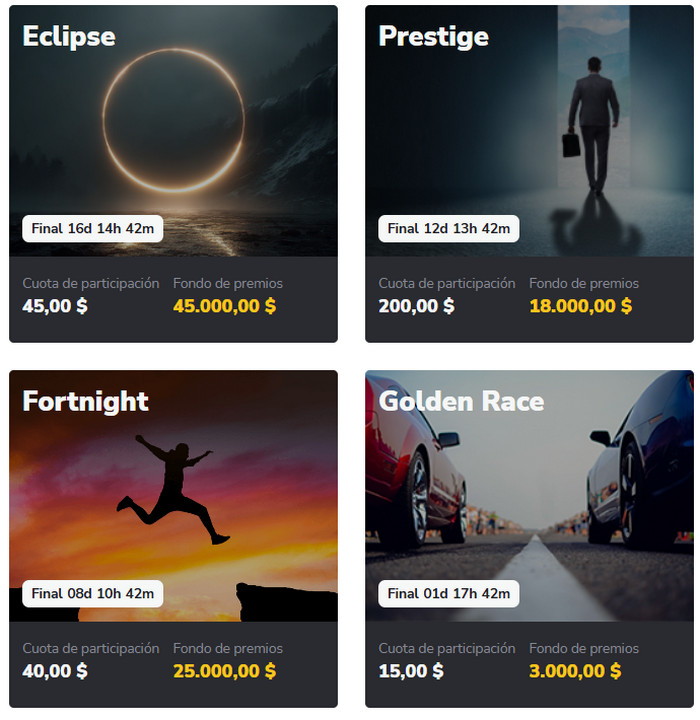 Son competiciones dentro de la plataforma donde los usuarios operan en un entorno simulado o real, con un objetivo claro: obtener la mayor rentabilidad posible en un tiempo determinado. Cada torneo tiene reglas específicas, un costo de participación y un fondo de premios que varía según la categoría.