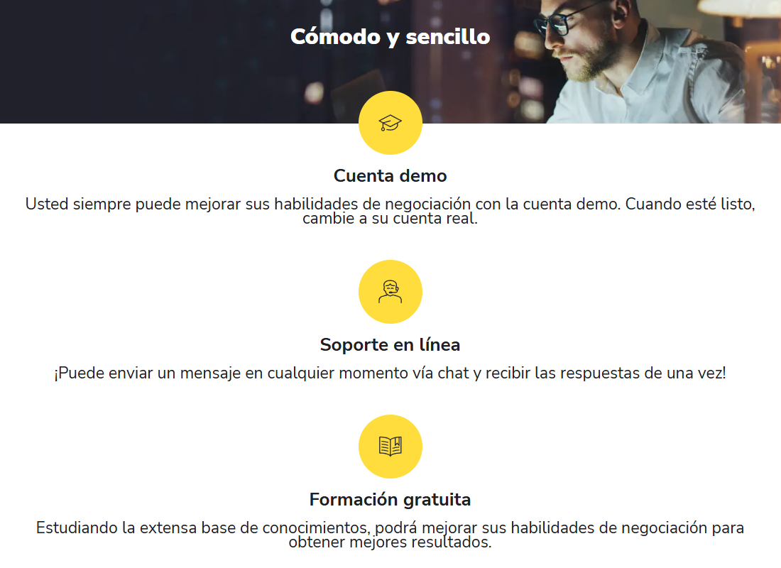 Antes de analizar cada sección, Binomo presenta ventajas clave: permite empezar con inversiones bajas, ofrece la posibilidad de abrir múltiples operaciones al mismo tiempo, habilita el trading durante los fines de semana y brinda acceso a cuentas demo para practicar sin riesgo de perder capital.